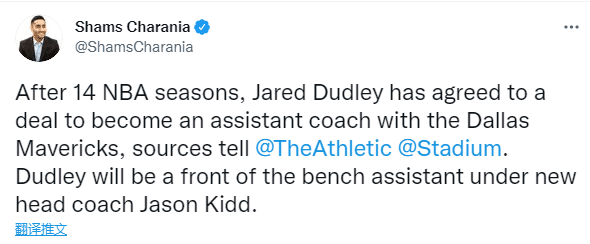 杜德利还发推:我为了这一刻准备了很长的时间!在此期间我和纳什、格兰特-希尔、奥尼尔、詹姆斯、布克、比尔、浓眉、字母哥等人都进行过深入的探讨,非常高兴能加入独行侠和基德的教练团队。这个职位对我来说再适合不过了,这是一次很好的机会。是时候准备开始新工作了!