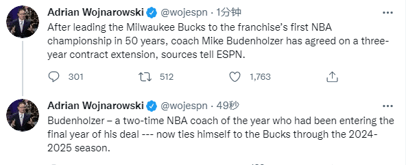 布帅曾在14-15赛季和18-19赛季夺得年度最佳主教练,现在更是成为NBA总冠军教头,这一份3年提前续约合同便是对布帅最大的认可,未来4年,布帅将继续执教字母哥,继续冲击总冠军;布帅曾调侃想要一份20年的续约合同,如今新的三年合同到手了。