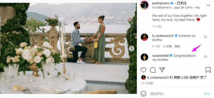来源:24直播网08-24 19:1124直播网讯 北京时间8月24日,掘金球员奥斯汀-里弗斯正式宣布求婚成功,他在意大利向女友求婚,单膝跪地真挚求婚,为爱人戴上硕大的钻戒,并且拥抱亲吻爱人;湖人新援威少第一时间留言:恭喜我的兄弟;本-麦克勒莫也恭喜小里弗斯。