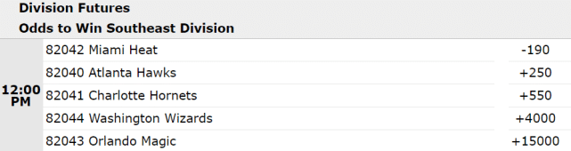 热火是东南赛区最被看好的球队,他们的分区冠军赔率是-190。洛瑞的加盟,让热火的实力进一步提升。位居第二的是上赛季冲进东部决赛的老鹰,他们的赔率是+250。黄蜂位居第三,赔率达到+550。送走威少的奇才排名第四,赔率是+4000。在这个分区里,魔术最不被看好,赔率是+15000。