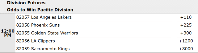 这是一个竞争比较激烈的赛区。湖人是分区冠军赔率排名第一的球队,他们的赔率是+110。休赛期,他们引进威少,组成三巨头,如果没有伤病的困扰,湖人在整体实力上还是有优势的。这一分区可能对他们构成威胁的球队是太阳和勇士。太阳的分区冠军赔率是+225,勇士是+300,离湖人都不算太远。莱昂纳德因伤可能赛季报销,快船的赔率是+1200,排在第四。国王是这个分区实力最弱的球队,他们的赔率只有+8000。