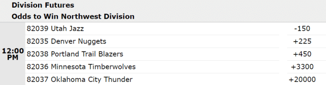 爵士是西北赛区最被看好的球队,他们的分区冠军赔率是-150。掘金紧随其后,赔率是+225,他们拥有MVP约基奇,但穆雷的伤病让他们的战绩可能会受到影响。排名第三至第五的依次是开拓者(+450)、森林狼(+3300)和雷霆(+20000)。