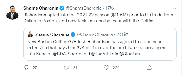 今年休赛期,理查德森执行最后一年1160万美元的球员选项,之后他被独行侠交易到凯尔特人;现在他和凯尔特人提前续约1年1240万美元新合同,未来2年凯尔特人将支付给他2400万美元。