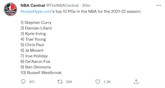 库里排名控卫榜第一,没有什么争议。2020-21赛季,库里场均32分5.5篮板5.8助攻,场均命中5.3个三分球,三分命中率42.1%,成为联盟得分王。美媒认为论及综合实力,库里绝对是现役第一控卫,而老搭档汤普森的复出,可以减轻库里的压力,有利于库里打出更高效的表现。