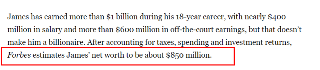 扣除纳税、开销等因素后,詹姆斯的净资产是8.5亿,而且福布斯也给出了这8.5亿净资产的分布状况。其中,他的SpringHill公司价值3亿美元,房产价值1亿美元,芬威体育集团的股份价值7000万美元,他的披萨产业价值3000万美元。此外,他的现金和其他投资还有3.5亿美元,合计8.5亿美元。
