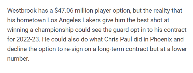 威少的合同还剩下两年,2021-22赛季是4421万美元,2022-23赛季是球员选项,价值4706万美元。马克斯指出,在家乡球队洛杉矶湖人效力,给了威少最好的夺冠机会,可以预见的是他很可能会选择执行2022-23赛季的选项,继续留在湖人。