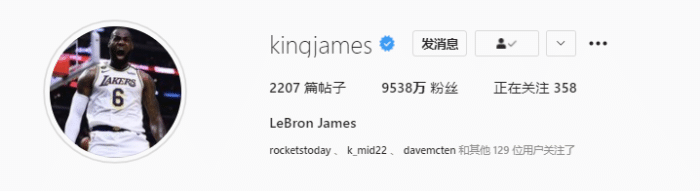 此前威少正式加盟湖人后,詹姆斯曾把头像换成自己夺冠后抽雪茄的霸气照,现在詹姆斯又一次更换头像;目前詹姆斯在Ins上拥有9538万粉丝,Ins粉丝破亿只是早晚的事,詹姆斯推特粉丝5000多万,真不愧为公认的社交媒体之王。