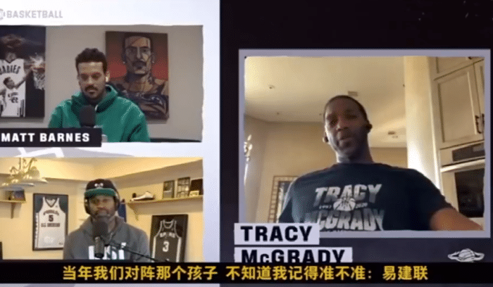 麦蒂感慨“当年我们对阵的那个孩子,不知道我记得准不准:易建联(巴恩斯和杰克逊均点头重复点名易建联)那小子真的不错,当时他效力的雄鹿队,那一场姚明对阵易建联,在密尔沃基。你们知道吗?有2亿人因为姚易大战观看了那场比赛直播,有2亿观众啊兄弟,姚明提升了火箭所有人的品牌价值,不仅仅是我!”