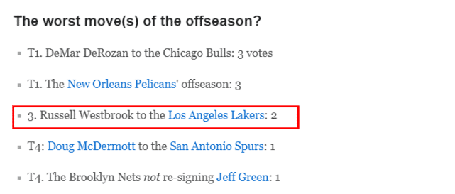 在最烂运作评选中,公牛签下德罗赞得到3票,排名第一,鹈鹕休赛期运作得到3票,位居第二。湖人交易到威少获得2票,排在第三。马刺签下迈克德莫特和篮网未能续约杰夫-格林各得1票,并列第四。