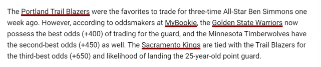 一周前的交易赔率排名上,开拓者是西蒙斯新下家的头号热门,而最新交易赔率显示,这个位置已经被勇士占据。目前,勇士以+400的赔率排在西蒙斯新下家的首位,森林狼(+450)位居第二,开拓者和国王同为+650,并列第三。