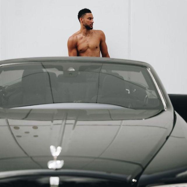 照片上,西蒙斯赤膊上阵,在对抗中训练运球和投射,挥汗如雨。训练结束后,帅气的西蒙斯也不忘了秀秀豪车,同样是赤膊拍照,咧嘴大笑,颇有几分杂志写真的既视感。