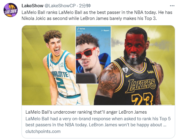 黄蜂新星“三球”拉梅洛-鲍尔表示他本人是当今联盟传球最好的球员,掘金球星约基奇排在第二位,而詹姆斯仅仅排在第三位;另外保罗和特雷-杨也上榜。