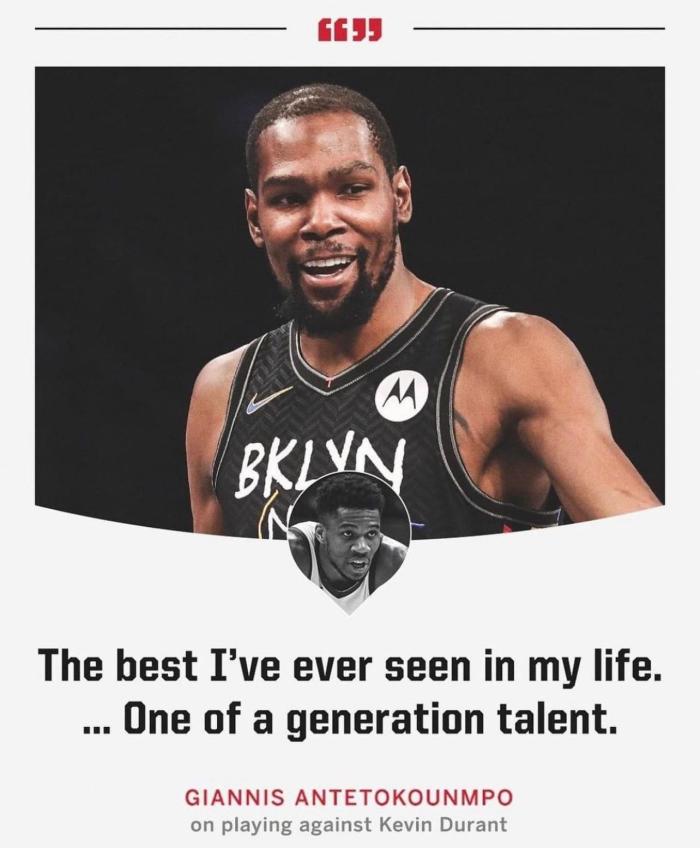 不久前,字母哥本人也盛赞杜兰特,直言:杜兰特是我见过的最强球员,他的天赋百年才能一遇。