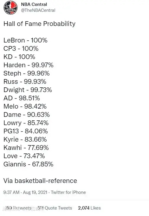 来源:24直播网08-19 20:3624直播网讯北京时间8月19日,权威数据网站BasketBall-Reference(BBR)更新了最新的现役球员入选名人堂概率,其中3人达到了100%!