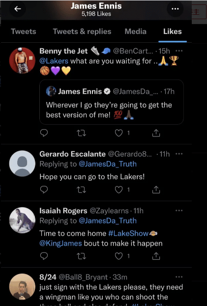 比如说在锋位摇摆人上,曾经被很多球迷视为优质3D球员的恩尼斯昨天点赞了球迷要求湖人签下他的动态,恩尼斯也表态,无论我去哪里打球,他们都将得到最好模式的我。