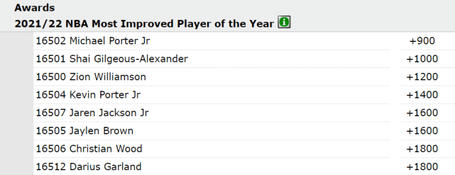 最新赔率显示,掘金的小波特成为新赛季进步最快球员的头号热门,他的当选赔率是+900。2020-21赛季,小波特已经有很出色的表现,如今他被看好在新赛季有更大的进步。赔率紧随其后的是雷霆的亚历山大(+1000)、鹈鹕的锡安(+1200)、火箭的小波特(+1400)、灰熊的小杰克逊(+1600)和凯尔特人的杰伦-布朗(+1600)。