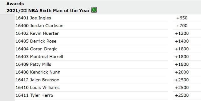 最新赔率显示,爵士的英格尔斯成为新赛季最佳第六人的头号热门,他的当选赔率是+650。紧随其后的是他的爵士队友克拉克森(+700)。克拉克森也是2020-21赛季的最佳第六人。赔率排名在他俩后面的依次是老鹰的赫尔特(+1200)、尼克斯的罗斯(+1400)、猛龙的德拉季奇(+1800)、奇才的哈雷尔(+1800)和篮网的米尔斯(+1800)。