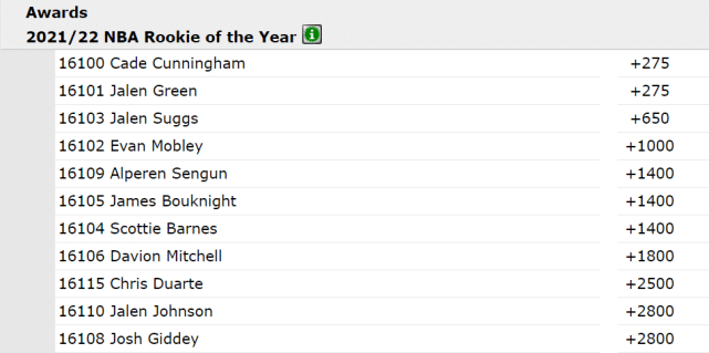 最新赔率显示,活塞状元坎宁安和火箭榜眼格林一起成为新赛季最佳新秀的头号热门,他俩的当选赔率同为+275。夏季联赛上,两人的表现都可圈可点。赔率紧随其后的是魔术的萨格斯(+650),骑士的莫布里(+1000)、火箭的申京(+1400)、黄蜂的伯克奈特(+1400)、猛龙的巴恩斯(+1400)。