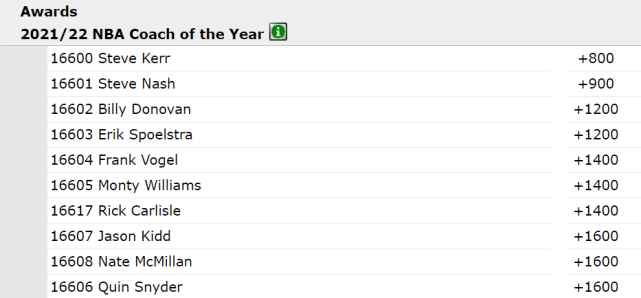 来源:24直播网08-19 09:4024直播网讯 北京时间8月19日,2021-22赛季的六大奖项最新赔率出炉。常规赛MVP赔率方面,独行侠球星东契奇排名第一。而在年度最佳主教练的赔率方面,勇士主帅科尔成为头号热门。