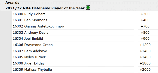 最新赔率显示,爵士的戈贝尔成为新赛季最佳防守球员的头号热门,他的当选赔率是+300。生涯至今,戈贝尔已经三次获得这一奖项,新赛季,他依然被继续看好。赔率排名第2-5位的依次是西蒙斯(+400)、字母哥(+700)、浓眉(+800)、恩比德(+900)。