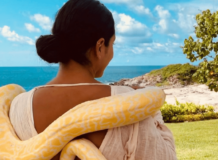 这是一只黄色的蟒蛇,它缠绕在瓦妮莎身上,应该属于宠物性质的蛇,即便如此,也已经够吓人了。而瓦妮莎却丝毫不害怕,还背对着镜头进行拍照,她似乎很享受这个时刻。
