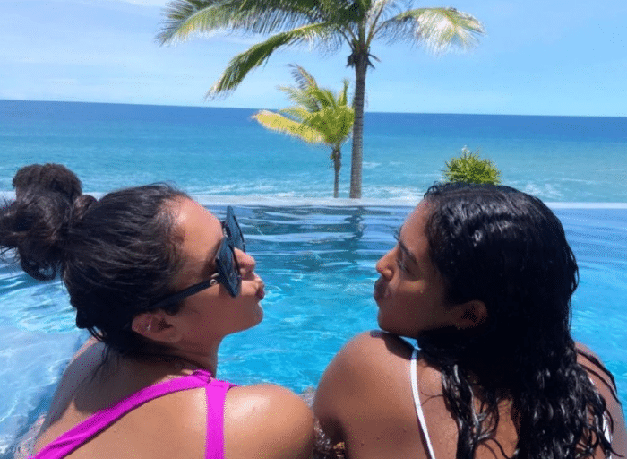 在瓦妮莎晒出的最新照片中,她的小女儿在游泳池旁边玩耍,非常开心。而瓦妮莎也和大女儿娜塔莉亚在泳池边上做出亲吻的动作,她们既是母女,也更像姐妹,娜塔莉亚是瓦妮莎最好的“朋友”。