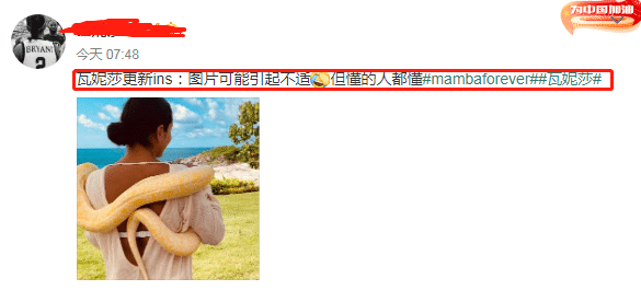 一般来说,常人看到这个级别的蟒蛇,会被吓坏了,会充满恐惧感,但瓦妮莎却和这只蟒蛇成为了“朋友”。不是瓦妮莎不害怕,而是她实在太想念科比了,众所周知,科比也被大家称为“黑曼巴”,瓦妮莎和蟒蛇近距离接触,她有这样的举动,也是在间接表达她有多想念科比。