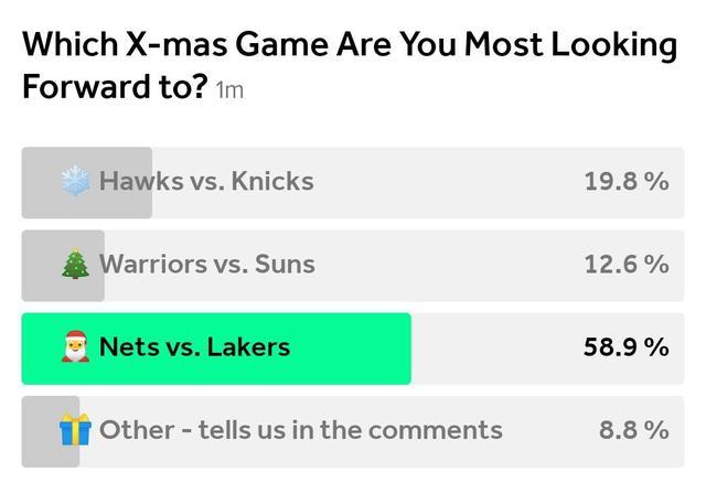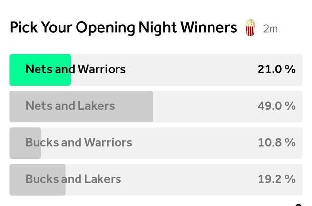 美媒B/R就首日的比赛结果进行球迷投票调查,结果49%的球迷认为篮网和湖人分别取胜。