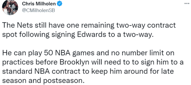 夏季联赛的赛场上,爱德华兹打了3场比赛,场均5.7分4篮板,对奇才一战是他发挥最好的比赛,得到14分9篮板2盖帽。双向合同规定,他最多可以为篮网出战50场比赛。