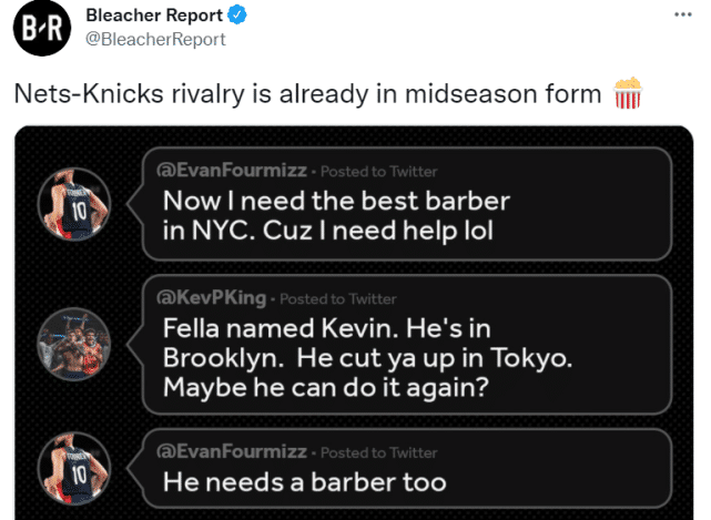 富尼耶在社媒上写道:“现在,我需要纽约最好的理发师,因为我需要帮助。”一个球迷回复道:“有个哥们叫凯文(杜兰特),他住在布鲁克林。他在东京给你剃了个光头,或许他可以再来一次?”富尼耶回应道:“他同样需要一个理发师。”
