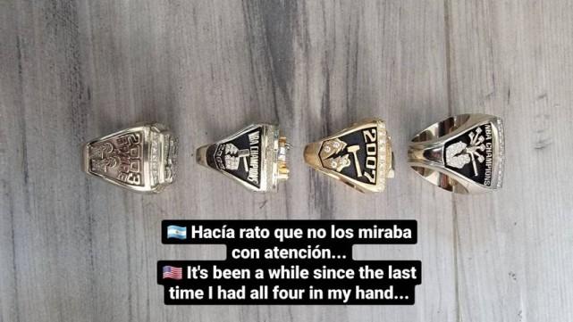 随后,吉诺比利还给这四枚总冠军戒指来了个特写,并配文道:“距离上一次我把这四个戒指都戴在手上,已经好久了。”