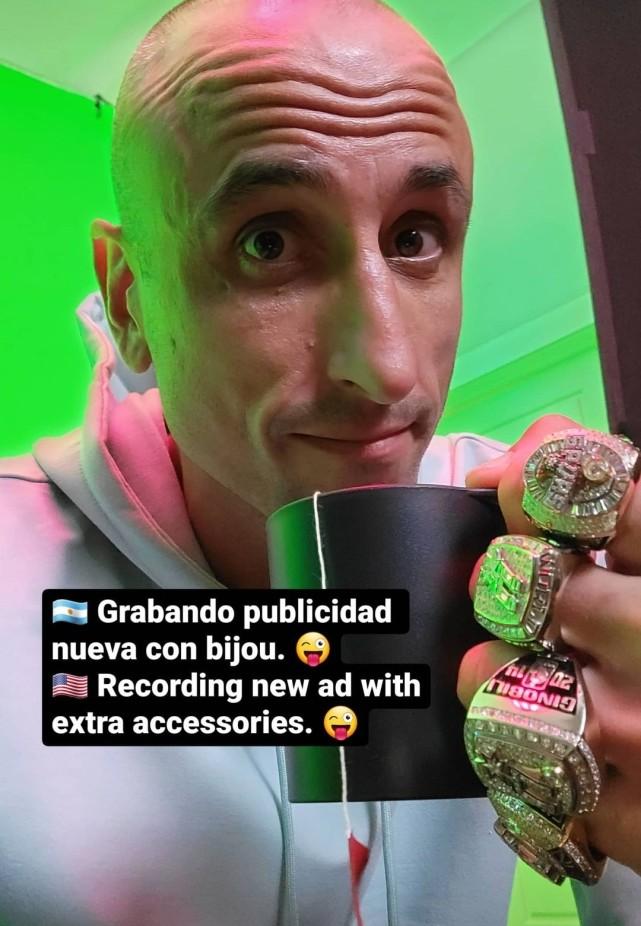 来源:24直播网08-17 15:2024直播网08月17日讯 前NBA球星马努-吉诺比利更新社媒,晒出了自己拍广告时的照片。照片上,吉诺比利拿起一个杯子,手上的四枚总冠军戒指格外抢眼。他配文写道:“正在拍新广告,戴着额外的饰品。”阿根廷妖刀,真是难得秀一把。