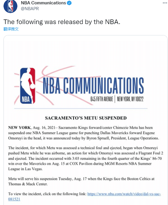 来源:24直播网08-17 15:0524直播网08月17日讯 ,针对国王和独行侠夏联比赛中的冲突事件,NBA官宣国王球员梅图因肘击独行侠新秀的头部而被禁赛一场,因此他将缺席和凯尔特人的比赛。