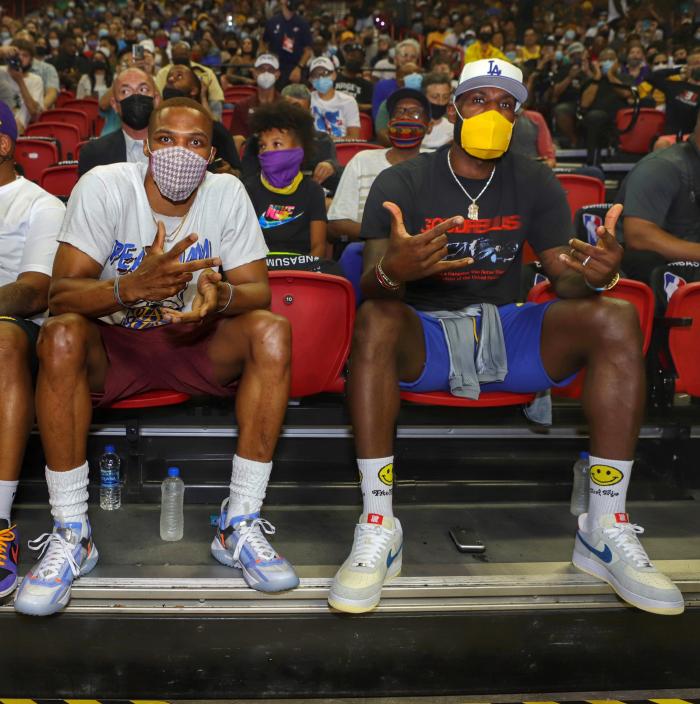 詹皇威少观战夏联!湖人双巨现身引欢呼,老詹逗得威少笑弯了腰