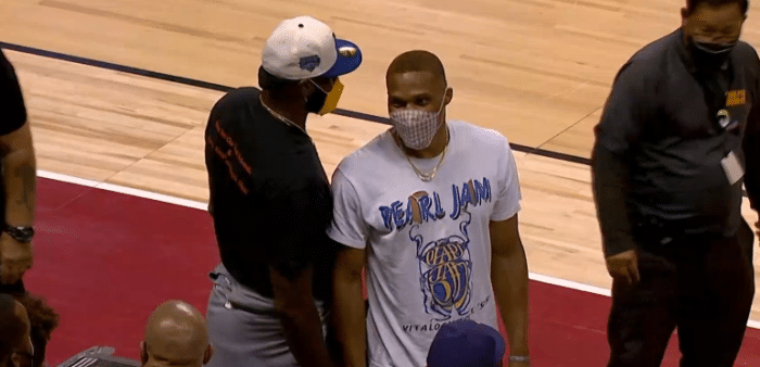 詹姆斯身穿黑色T恤和蓝色短裤,戴着理查德-米勒名表和金链子,并且戴着一顶白色棒球帽;威少则是身穿白色T恤并且戴着格子口罩,他和詹姆斯都坐在场边观战,两人有说有笑十分融洽;威少的新发型十分抢镜,把板寸短发染成了金黄色。