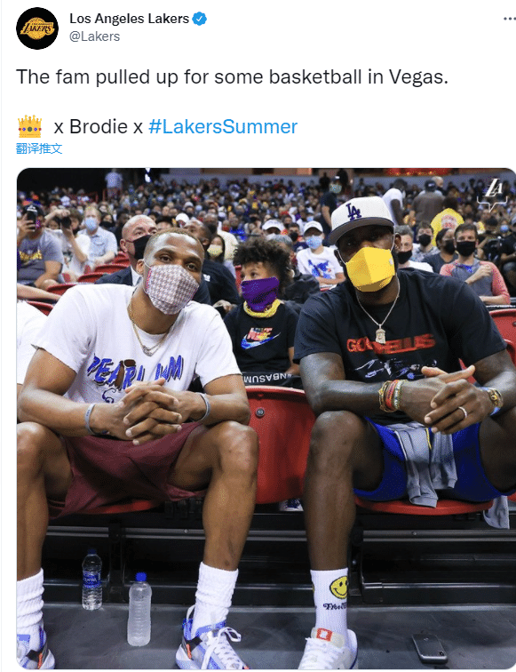 湖人官推晒出詹姆斯和威少痛苦合影,写道:家人们来到拉斯维加斯打篮球。