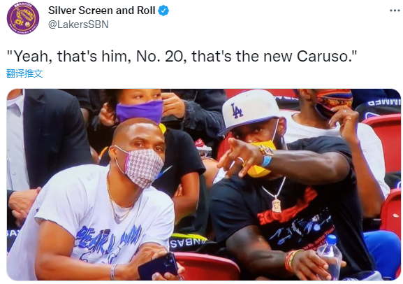 詹姆斯指着让威少看球场的球员,美媒Silver Screen and Roll发推调侃这一幕:对,那就是他,身穿20号球衣,那就是新的卡鲁索。