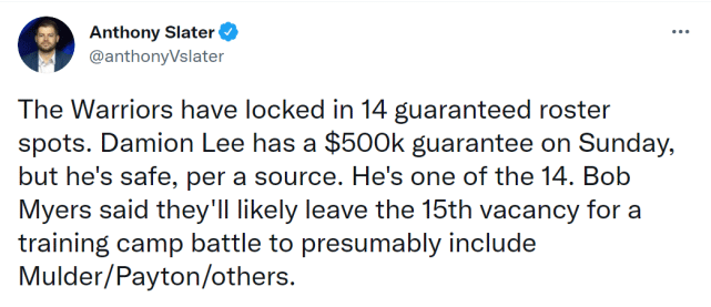 目前已经锁定常规阵容14人名单的球员是:库里、汤普森、格林、维金斯、怀斯曼、伊戈达拉、穆迪、库明加、卢尼、普尔、托斯卡诺-安德森、达米恩-李、别利察、奥托-波特。勇士新赛季的总薪水是1.74亿美元,排名30支球队之首。