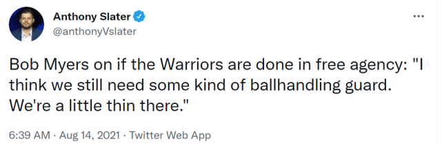 勇士的自由球员签约是否已经接近尾声?迈尔斯表示,他认为球队还需要一个能控球的后卫,他们在这个位置上深度有些薄弱。穆尔德和小佩顿有可能获得这个位置。