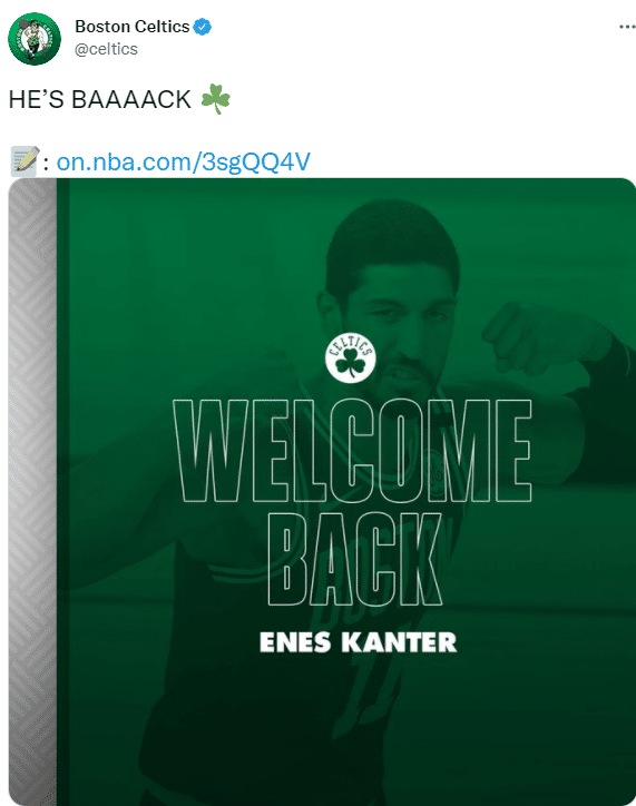 凯尔特人还正式官宣坎特重返波士顿,他新签一份一年老将底薪合同再次披上绿军战袍,上赛季他为开拓者效力,打满72场常规赛,场均可以拿到11.2分和11个篮板。