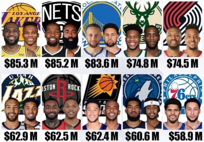 排在第二位的是杜兰特哈登组合,下赛季薪水8520万,值得一提的是这是他们续约之前的薪水!未来他们会领到更多的薪水,杜兰特已经跟球队签下了4年1.98亿的顶薪,均年薪接近5000万。而哈登也不便宜,篮网GM表示训练营之前跟哈登欧文敲定续约,薪资专家分析篮网打算给哈登3年1.61亿的合同,这薪水超过了5000万,蔡老板真是财大气粗!