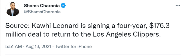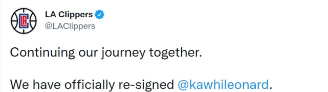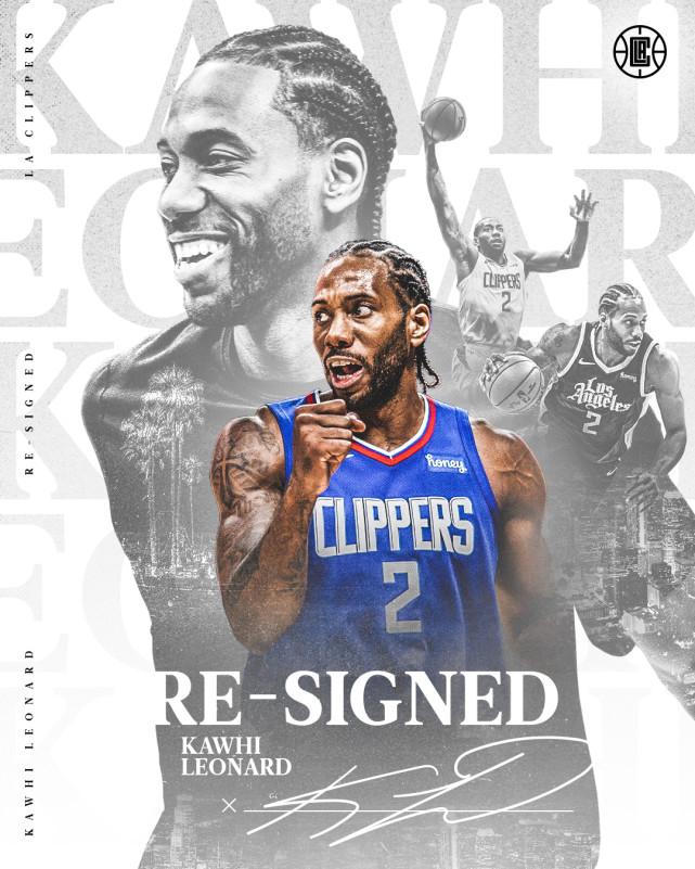 快船官方写道:一起继续我们的旅程,我们已经正式和科怀-莱昂纳德续约了!