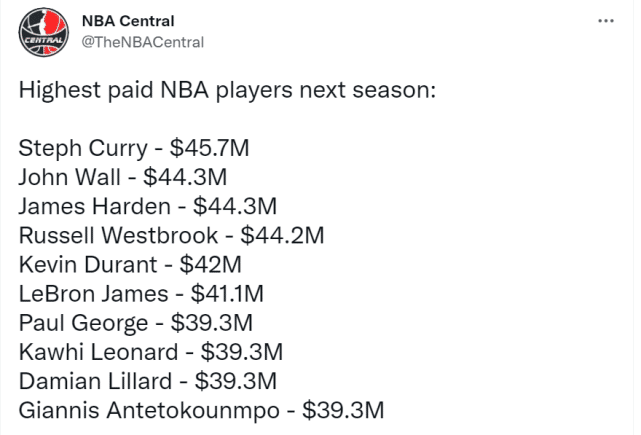 美媒公布新赛季年薪前10排名!库里4570万居首 沃尔哈登并列第二