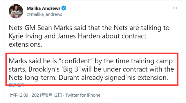 也就是说,如果一切顺利,篮网可以在新赛季开始前豪掷5.45亿美元提前续约三巨头,这样三巨头未来5年都将一起在篮网效力。