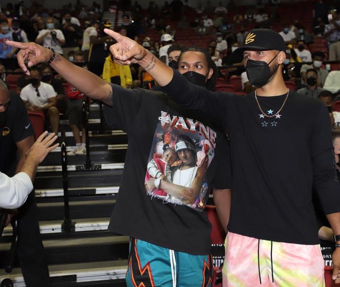 库里戴着一顶黑色棒球帽、黑色长袖T恤搭配鲜艳的短裤,和勇士总经理鲍勃-迈尔斯坐在一起,戴着金链子坐在场边观战;库里还接受美女记者的采访,直言相信勇士仍旧是一支强大的球队;今年休赛期,库里和勇士提前续约5年2.15亿美元超级顶薪,成为NBA历史首位签下两份2亿+合同的球员。