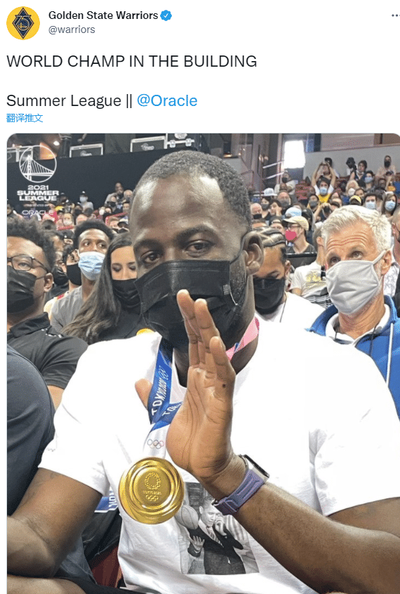 勇士官方晒格林冲着镜头炫耀金牌的场边照,发推:世界冠军在球馆里。