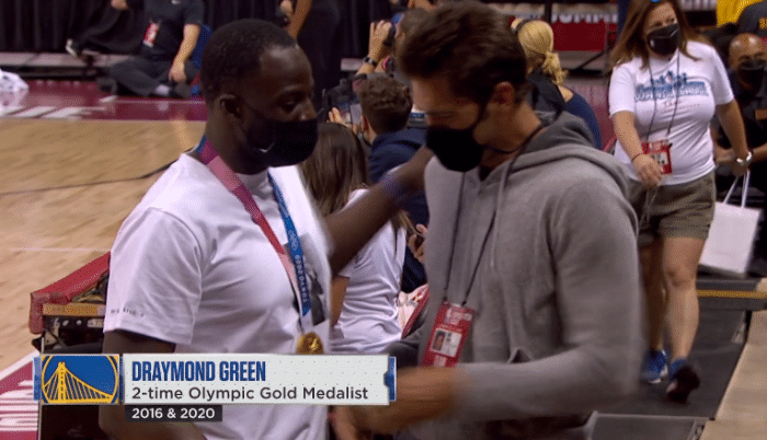 勇士另一球星德拉蒙德-格林是在第二节来到场边,身穿黑色短裤和白色T恤,戴着金灿灿的奥运金牌出镜,先是和总经理打招呼,鲍勃-迈尔斯两眼发光,之后格林和库里击掌,然后坐在库里傍边看比赛。