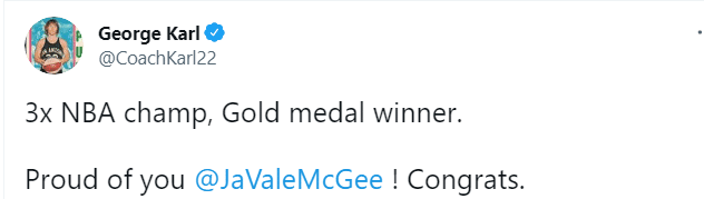 麦基刚刚跟随美国男篮夺得奥运金牌,卡尔晒出麦基效力掘金时的照片,并配文写道:“3次NBA总冠军,金牌赢家,我为你感到骄傲,麦基!祝贺你!”
