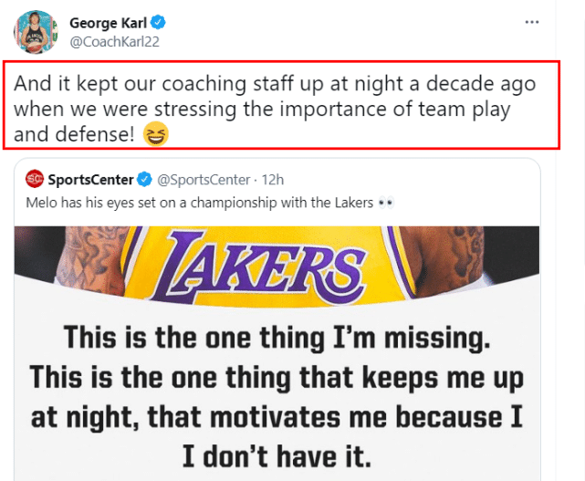 在今天的采访中,安东尼说没有夺冠,让自己夜不能寐。卡尔转发了安东尼的这一言论,调侃道:“10年前,当我们教练组强调团队篮球和防守的重要性时,我们也睡不着!”