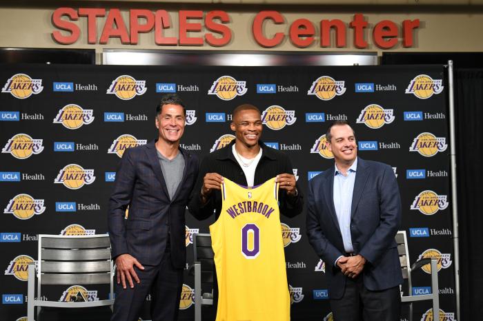 这是威少加盟湖人后首次以湖人球员的身份正式亮相。